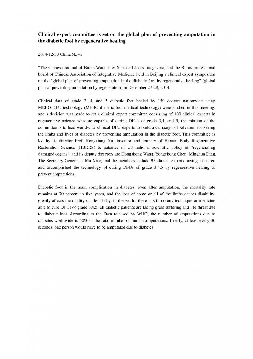 Clinical expert committee is set on the global plan of preventing amputation in the diabetic foot by regenerative healing
